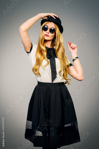attractive, girl, blouse, sunglasses, skirt, fashionable, beautiful, adult, beauty, black, caucasian, charming, cheerful, posh, clothes, clothing, elegant, fashion, female, feminine, glamour, hair, happiness, happy, hat, holiday, human, joyful, lady, long hair, model, modern, natural, people, person, portrait, posing, pretty, relaxed, romantic, sexy, smiling, studio, stylish, summer, vitality, white, woman, young