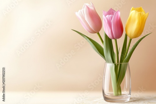 Tres tulipanes delicados en un jarrón de vidrio sobre una superficie clara y suave en un ambiente iluminado