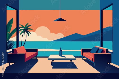 beach, sea, summer, palm, island, water, tropical, ocean, tree, sand, holiday, sun, travel, vacation, sky, vector, pool, landscape, illustration, nature, resort, umbrella, paradise, boat, relax