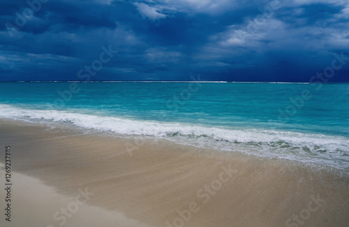 Tropical beach of Indian Ocean, dramatic sky over turquoise lagoon. Storm approach. Beautiful seascape. Mauritius island.