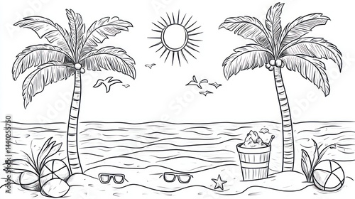 beach, palm, tree, ocean, summer, vacation, relax, tropical, sand, sun, sea, coconut, sunglasses, drink, ice, bucket, bird, sky, holiday, travel, paradise, coast, shore, water, wave, escape, fun, joy, freedom, calm, peaceful, serene, warm, hot, sunny, beautiful, scenic, landscape, nature, illustration, design, graphic