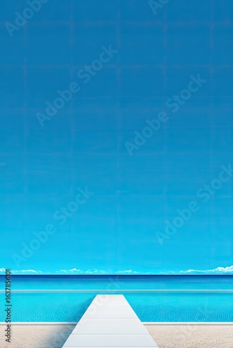 beach, water, sky, blue, white, dock, tropical, summer, vacation, paradise, ocean, calm, horizon, light, sand, pool, perspective, landscape, digital, illustration, empty, quiet, peaceful, relaxing, exterior, view, minimal, geometric, design, texture, idylli, high-coloured, clear, tranquil, still, sun, horizontal, geometry, graphic, art, flat, modern, clean