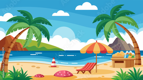 beach, sea, palm, island, summer, tropical, tree, sand, ocean, water, sun, travel, vector, sky, illustration, paradise, vacation, landscape, nature, holiday, wave, palm tree, cartoon, resort, vacation