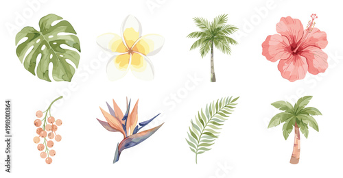 tropical, hibiscus, plumeria, monstera, palm, watercolor, flower, leaf, foliage, plant, exotic, collection, floral, bird, paradise, summer, botanical, nature, greenery, garden, blossom, frond, sticker, decal, isolated, set, element, design, illustration, painting, art, pastel, pink, yellow, green, beach, island, vacation, jungle, flora, white, background, colourful, decorative, elegant, organic, spring, tree branch, berry