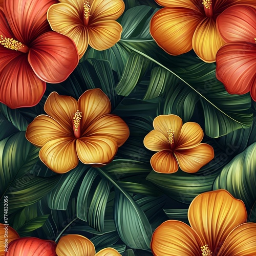 Tropical flower seamless pattern design botanical art vibrant colors nature background detailed view realistic concept