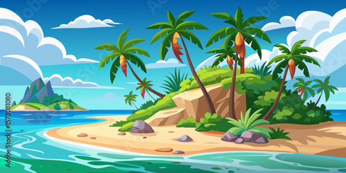 tropical island, paradise beach, palm tree, ocean, sand, beach, turquoise water, clear sky, cloud, rock, vegetation, summer getaway, holiday, travel, exotic, idylli, scenic, beautiful, calm, serene, relaxing, escape, get-away, cartoon, illustration, vector, graphic, design, art, background, wallpaper, poster