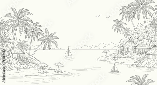 tropical, island, palm, tree, ocean, sea, beach, coast, shore, water, sailboat, boat, sailing, vacation, holiday, paradise, exotic, nature, landscape, scenery, vignetting, drawing, monochrome, vintage, retro, travel, destination, relaxation, summer, sun, resort, bungalow, hut, umbrella, chair, wave, horizon, sky, cloud, mountain, hill, forest, jungle, vegetation
