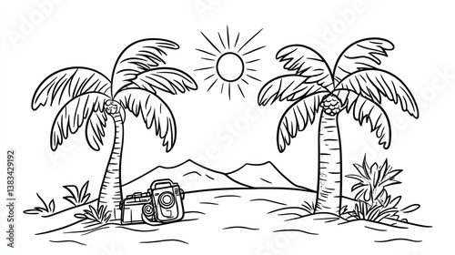 island, beach, vacation, tropical, palm, sun, camera, nature, relaxation, travel, summer, adventure, scenery, landscape, illustration, drawing, vignetting, graphic, line, art, black, white, monochrome, simple, design, relax, tour tourism, holiday, coconut, relaxing, outdoors, sunny, tree, mountain, paradise, scenic, vector, palm tree