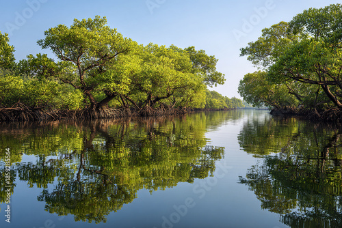 Tropical mangrove swamp with calm water reflecting lush green foliage under clear blue sky creating peaceful natural landscape scene