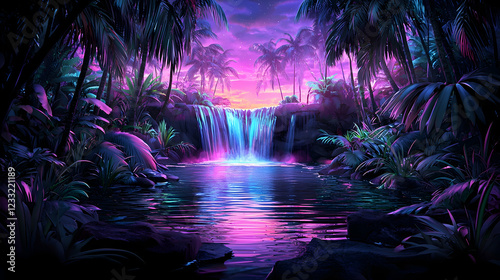 Tropical sunset waterfall, lush jungle, vibrant colors, serene pool