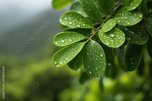 Tropics Humid Relaxation concept Close-up of green leaves with water droplets glistening.