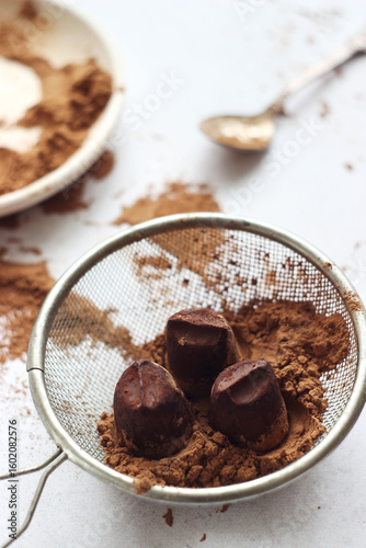 Truffle candies lie in a sieve on a gray table