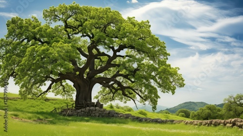trunk, spring, tree, illustration, oak, leaf, green, branch, canopy, shade, shelter, wildlife, strength, resilience, majestic, fresh, sprouting, nature, season, growth, renewal, blossom, flora, verdant, foliage, life, beauty, environment, ecosystem, habitat, renew
