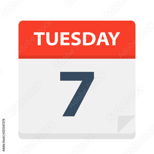 tuesday, 7, calendar, icon, vector, illustration, date, day, week, isolated, rounded, month, page, flat, red, grey, white, background, isolated on white, organiser, plan, schedule, time, today, template, square, leaf, paper, 2018, 2019, 2020, 2021, 2022