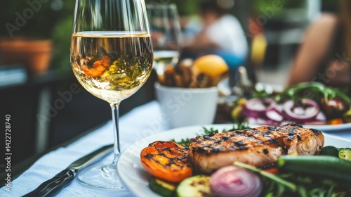 tuna, seafood, grill, vegetable, dining, tablecloth, wine, glasses, food, epicure, eatery, freshness, healthy, cookery, culinary, plate, delicious, upscale, elegant, meal, summer, picnic, favor, organic, lifestyle, nourishment, table setting, fine dining, vibrant, colourful, ingredient, harvest, presentation, savour, pairing, ambience, intimate, fork, knife, decoration, rustic, event, enjoyment, relaxation, taste, indulgence, social, dish