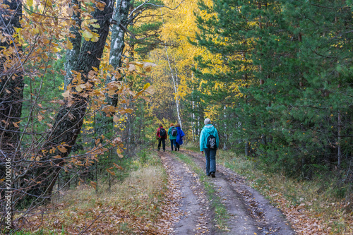 Туристы в осеннем лесу.