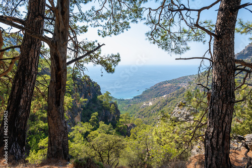 Turkey sea and mountain landscape photo, mediterranean Turkish coast area near Fethiye, taken on Lycian way hiking route. Nature, outdoor, hiking and trekking concept image