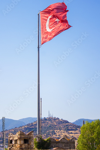 Turkish flag on the flagpole situated on the ancient walls of the Bodrum Castle (also known as St Peter Castle), popular Turkish landmark, Mugla, Turkey. Travel concept. Turkish resort