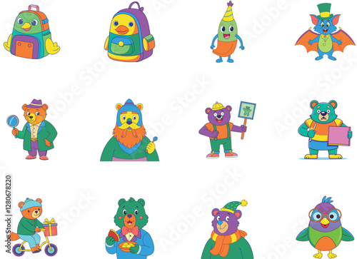 cartoon, animal, cute, backpack, bird, duck, bat, monster, bear, detective, magician, teacher, student, bicycle, gift, present, food, owl, goggles, purple, green, orange, yellow, blue, red, brown, vector, illustration, design, graphic, clip art, children, children, toddler, baby, fun, playful, happy, joyful, cheerful, smiling, colourful, bright