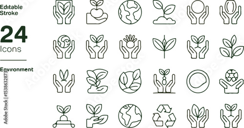 Twenty Four Black Line Art Icons Environment Theme Plant Earth Hands Growth Sustainability Recycle