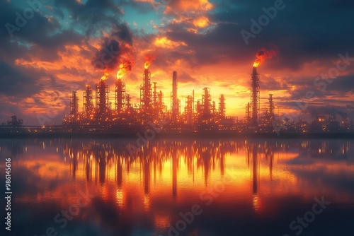 twilight refinery panorama gleaming industrial complex under vibrant sunset sky intricate pipelines weaving through towering structures reflections in nearby water atmospheric haze