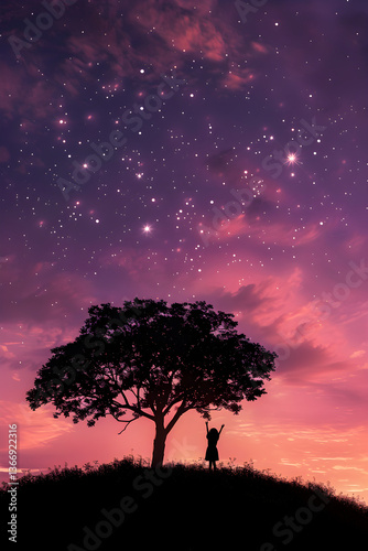 twilight, serenity, silhouette, tree, girl, star, achieving, dark, contrast, mystical, calmness, solitude, imagination, fairy tale, environment, fantasy, dream, dreamy, nature, childhood, adventure, dusk, serene, night, gloaming, peaceful, tranquil, scenic, wonder, exploration, outdoors, dramatic sky, colorful sky, evening, sunset, starry sky, innocence, playful, majestic, contemplative, whimsical, mystery, beauty, enchanting
