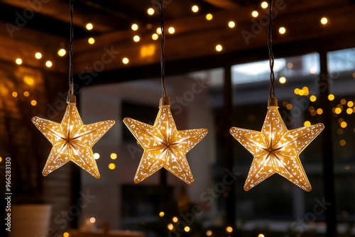 twinkling, star-shaped, christmas, light, hanging, ceiling, casting, celestial, glow, over, room