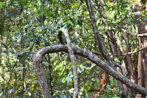 Twisted organic vines growing together with detailed rough texture. Old vintage plant growth outside in the woods. Hanging vine isolated on blurred background