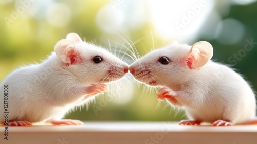 Two adorable white mice share a cute moment, nuzzling each other's noses, capturing the essence of curiosity and affection in their playful demeanor amidst a soft background.
