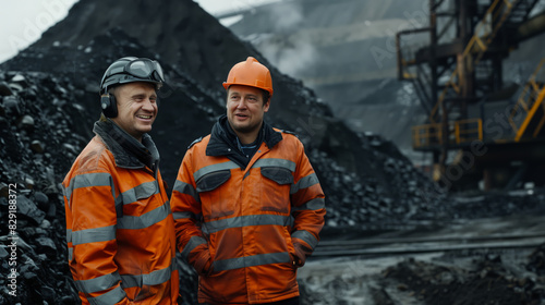 Two adult men in orange protective gear are standing in front of a pile of coal. Road construction. Mining of coal and other minerals