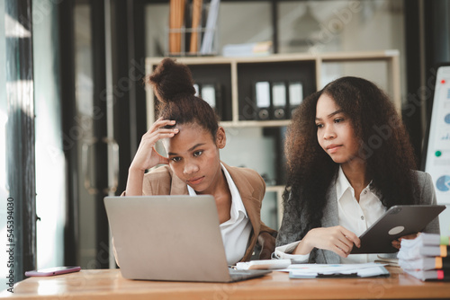 Two American women are working together in the office of a startup company. They are having a brainstorming and planning meeting in a joint department, women leading the way. Concept of women's work.