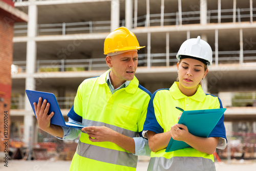 construction, project, development, man, woman, male, female, builder, engineer, manager, architect, developer, partnership, building, site, structural, experienced, expertise, serious, concentrating, renovation, maintenance, industrial, check, working, planning, communication, inspect, folder, plan, document, hard hat, men at work, technology, architecture, engineering, american, european, russian, notebook, laptop, computer, connection, application, online, professional, networking