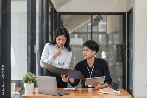Two asian business worker looking at folder and discussing corporate strategy in teamwork, working on computer laptop in office at office