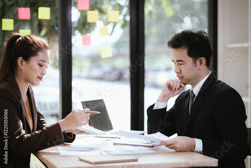 Two Asian businessmen in modern office having professional conversation using laptop and mobile phone. Communication, strategy and corporate success.