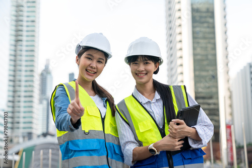 asian, engineer, construction site, city landscape, woman, confident, 2, working, together, background, portrait, smiling, female, technician, supervisor, real people, helmet, hard hat, real estate, teamwork, production, safety, men at work, professional, occupation, blueprint, work, engineering, construction, structure, technical, contractor, foreman, site, team, entrepreneur, building, development, architect, builder, business, manager, people, labor