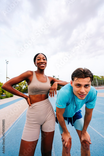 2, athlete, smiling, resting, track, people, copy space, sport, adult, woman, man, male, friendship, african american, ethnicity, black, season, mid, healthy, lifestyle, health, sky, nature, recreation, motivation, summer, young, leisure, female, african, american, teamwork, team, pair, urban, city, training, confidence, running, fitness, caucasian, exercising, competition, cloudy, companion