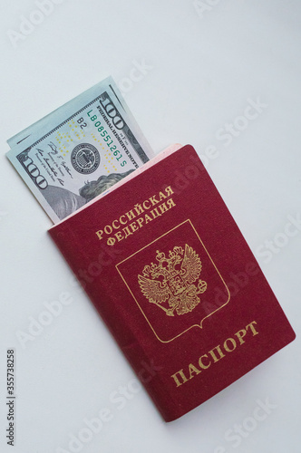 Two banknotes of 100 american dollars each, lying in the Russian passport on a white background