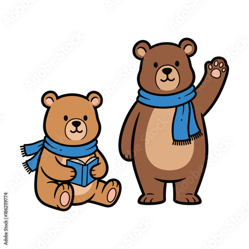 bear, bear, cartoon, reading, book, foulard, blue, sitting, standing, waving, paw, vector