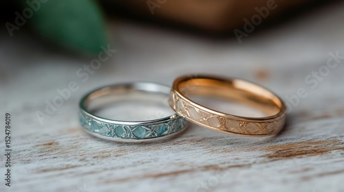 Two Beautifully Crafted Wedding Rings on Wooden Surface