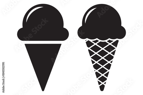 Two black silhouette ice cream cones with scoops on top isolated on white background