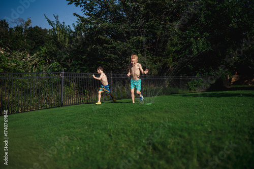 summer, greengrass, holding hands, family life, sibling, childhood, swimwear, brother, water hose, sprinkler, sunshine, oklahoma, us, two people, male, white
