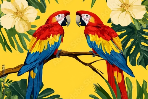 Two bright parrots perched on a branch among tropical leaves and flowers on a yellow background in a pop art style