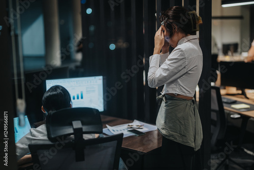 Two business professionals engaging in late-night work at the office. The image shows a focused environment with computers, indicating a deadline-driven or high-stakes situation, common in corporate