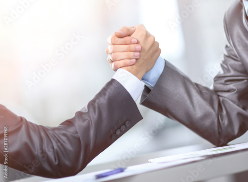 Two businessmen press hands with each other in the foreground. Fighting between entrepreneurs.