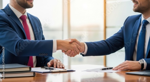 business, meeting, handshake, desk, office, man, suit, blue, red, attaching, paper, pen, agreements, partnership, deal, success, teamwork, collaboration, professional, work, corporate