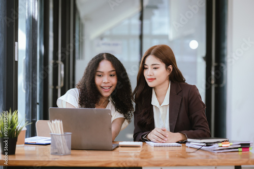 Two businesswomen in an office, business colleagues are having a conversation.