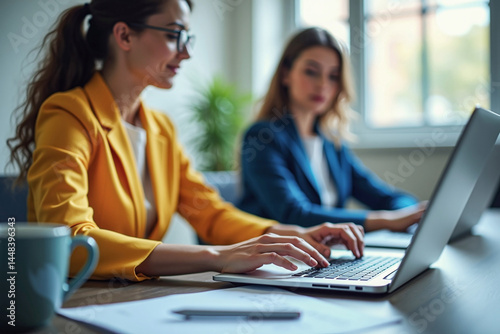 Two businesswomen working together in office using laptop and clipboard in teamwork collaboration, brainsotrm meeting concept with soft natural lighting
