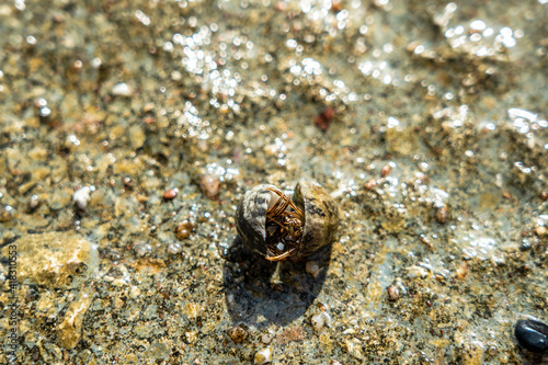 Two cancer hermit crabs mating on beach. Tropical animal