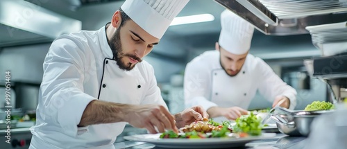 Two chefs carefully plating gourmet dishes in a modern kitchen