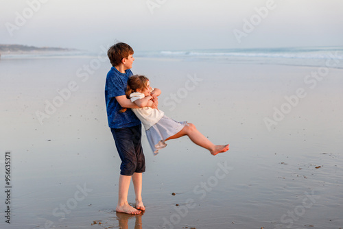 Two children on ocean beach. Teenager boy and little preschool sister having fun by sunset. Sea vacation for family. Siblings laughing and smiling. Happiness and love.